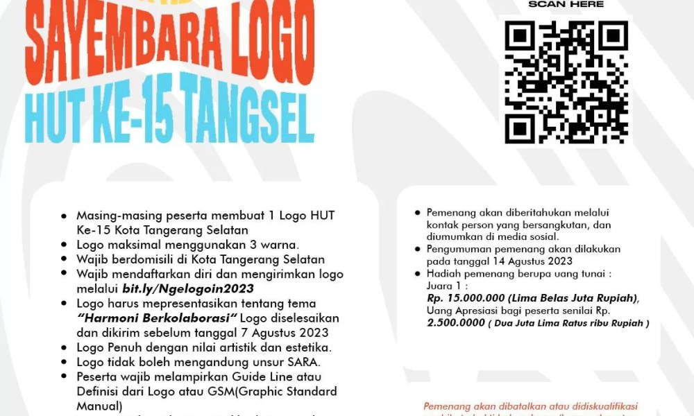 Dengan total hadiah mencapai 25 juta rupiah, diharapkan didapat karya terbaik yang akan mewarnai peringatan hari jadi Kota Tangerang Selatan.